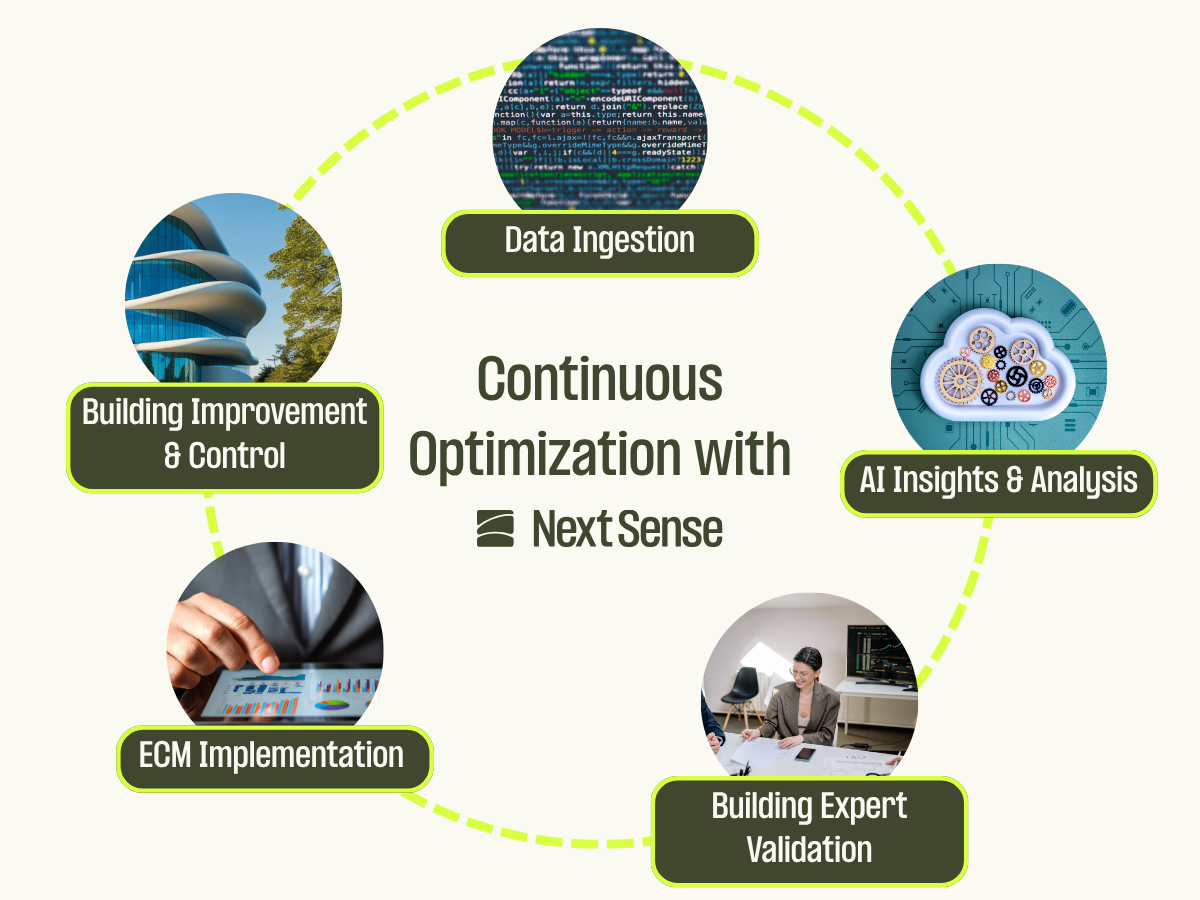 Next Sense brings together data, AI and expertise in one continuous optimization loop. Our platform is designed to not only analyse building performance, but to actively improve it - every day. Insights are accessible through an intuitive interface, including our Building AI Assistant that allows you to talk to your building.